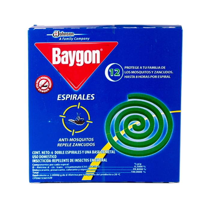 Baygon Espirales repelente contra zancudos y mosquitos. Ofrece 8 horas de protección. Actúa sobre el mosquito que puede transmitir el Dengue.