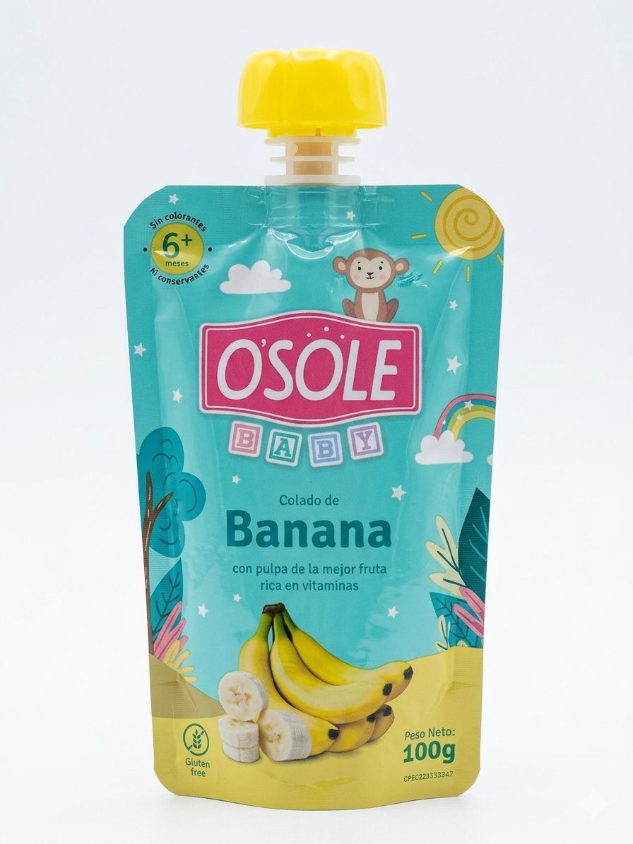 Osole de Banana es un producto de alimentación infantil con sabor a banana. Es un puré elaborado 100% con fruta, sin azúcares añadidos, colorantes ni saborizantes artificiales. El producto es apto para niños mayores de 6 meses y no contiene gluten.