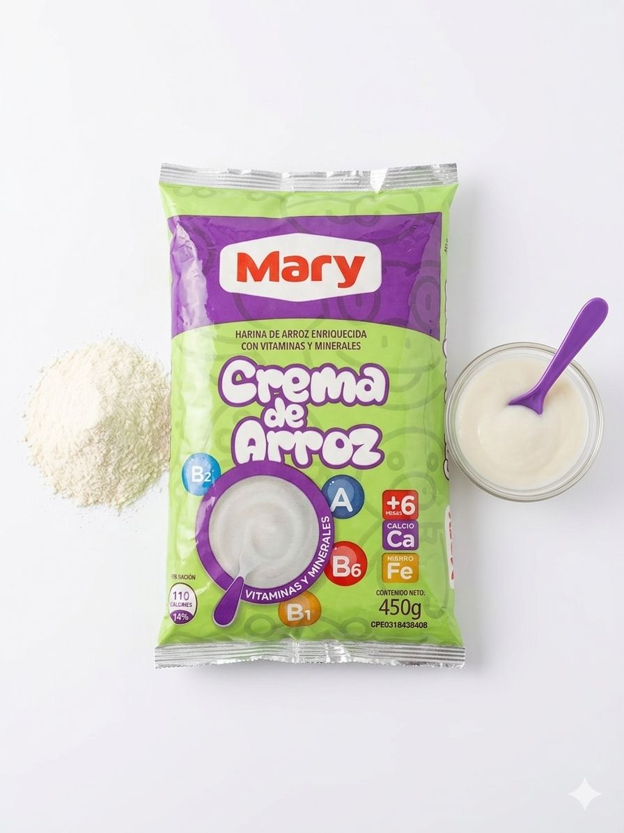 La Crema de Arroz Mary, es un cereal infantil y familiar enriquecido con vitaminas y minerales, libre de gluten.