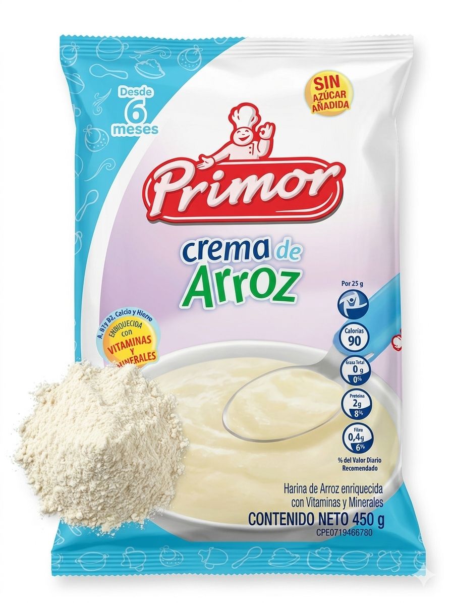 La Crema de Arroz Primor de 450g es un alimento en polvo elaborado a base de harina de arroz precocida, enriquecida con vitaminas y minerales.